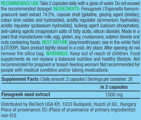 Χάρη στη μορφή της κάψουλας, το BioTechUSA Fenugreek είναι εύκολο στη χρήση και μπορείτε να το χρησιμοποιήσετε οπουδήποτε κατά τη διάρκεια της ημέρας. Η συσκευασία περιέχει 60 κάψουλες για 30 ημέρες.